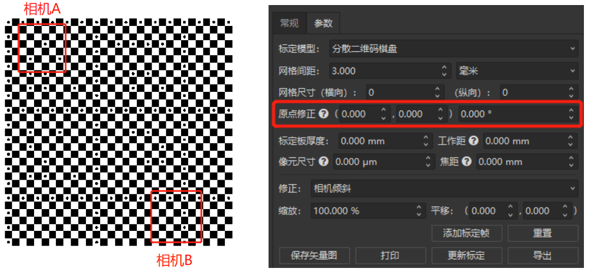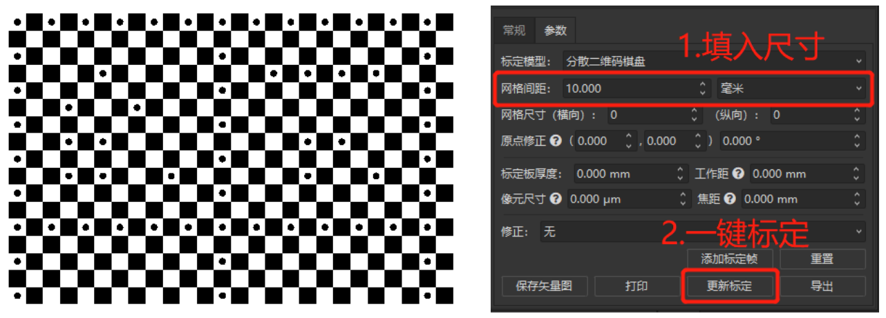 利珀科技為解決這個(gè)行業(yè)痛點(diǎn),開(kāi)發(fā)了圖2所示的分散型網(wǎng)格標定板,用戶(hù)只需要輸入網(wǎng)格間距1個(gè)參數,相機捕捉到標定板上的信息后即可完成“一鍵標定”,大大縮短了標定的過(guò)程,提高了標定的速度與成功率。