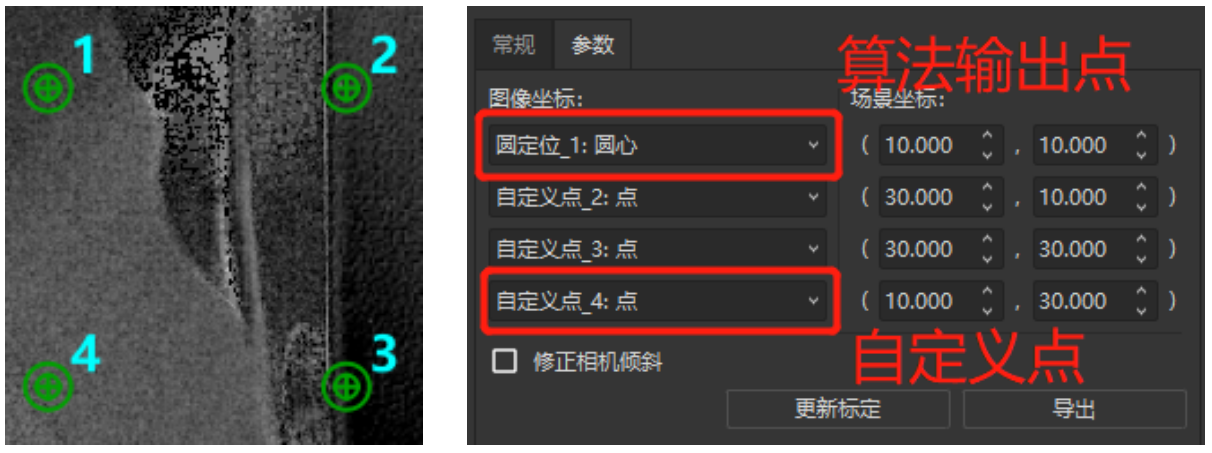 四點(diǎn)/九點(diǎn)標定都屬于多點(diǎn)標定,圖像坐標來(lái)源于自定義點(diǎn)或者算法輸出的特征點(diǎn),用戶(hù)只需要在對應的點(diǎn)上輸入世界坐標系的坐標,即可完成映射。這種標定方式通常用于視覺(jué)引導運動(dòng)控制系統進(jìn)行定位的場(chǎng)景。