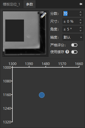 分數:對匹配到的模板相似度進(jìn)行評判,分數越高,匹配相似度的要求越高; 尺寸:可匹配的模板尺寸范圍,例如±50%,就是模板的50%~150%大小范圍內進(jìn)行匹配; 角度:可匹配的模板角度范圍,例如±180°,就是360°任意方向進(jìn)行匹配;; 精度:根據精度及速度的要求,用戶(hù)可以選擇從粗略到高的五個(gè)等級; 嚴格評分:是否對在評分中考慮丟失、遮擋或模糊的特征; 使用緩存:加速算法的執行速度,但是會(huì )占用額外的內存; 全圖檢測:用戶(hù)點(diǎn)擊如下圖所示的中ROI最大化按鈕即可。