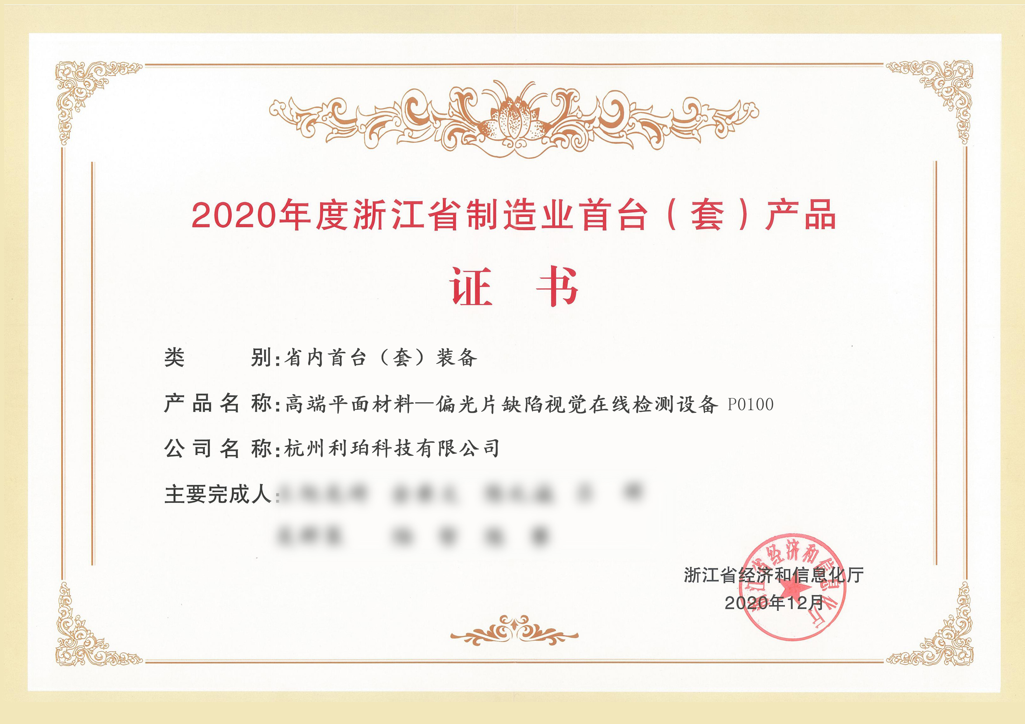 2020年度浙江省制造業(yè)首臺(套)產(chǎn)品證書(shū)-省內首臺套裝備...