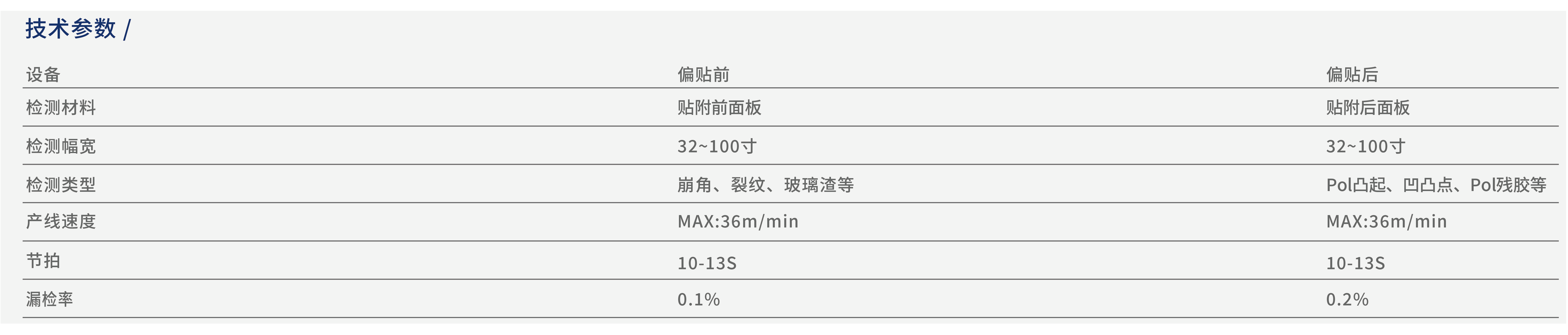 該設備用于RTP產(chǎn)線(xiàn)上Panel貼附前和貼附后的缺陷檢測,如貼附前的崩角、裂紋、玻璃渣等;貼附后的Pol凸起、凹凸點(diǎn)、Pol殘膠等;檢測后的OK/NG結果通過(guò)PLC輸出,并將缺陷信息傳輸到目檢工位。